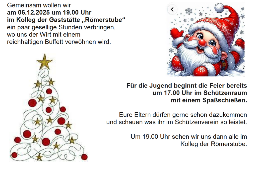| Sa 09.12.2023 17.00 Uhr | Nikolausschießen, direkt im Anschluss Weihnachtsfeier